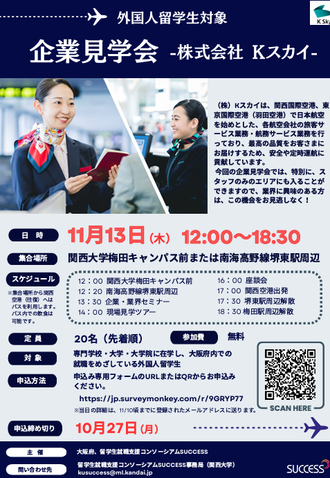対象:専門学校・大学・大学院に在籍し、大阪府内での就職を目指している外国人留学生