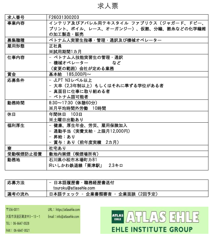 【求人情報】実習生通訳・管理、機械オペレーター in石川 F26031300203
